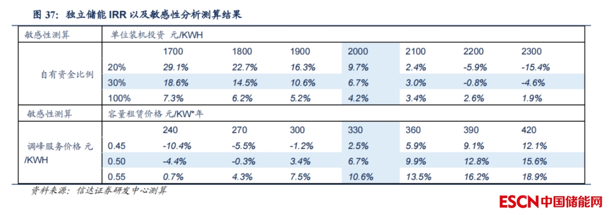 獨立儲能內部收益率對單位裝機投資、容量租賃價格、調峰服務價格敏感性較高。我們測算得到,單位裝機投資下降0.1元/Wh,內部收益率增加約4pct;調峰服務價格上升0.05元/kWh,IRR 提升約4pct;容量租賃價格提升30元/KW*年,IRR提升約 3pct。我們認為目前獨立儲能已有收益,且對部分調峰服務價格以及容量租賃價格較高的省份,獨立儲能收益率比我們測算結果更高。另外,獨立儲能在電力系統(tǒng)的地位日益提升,政策對收益模式正不斷探索及完善,獨立儲能的收益率未來邊際向好。