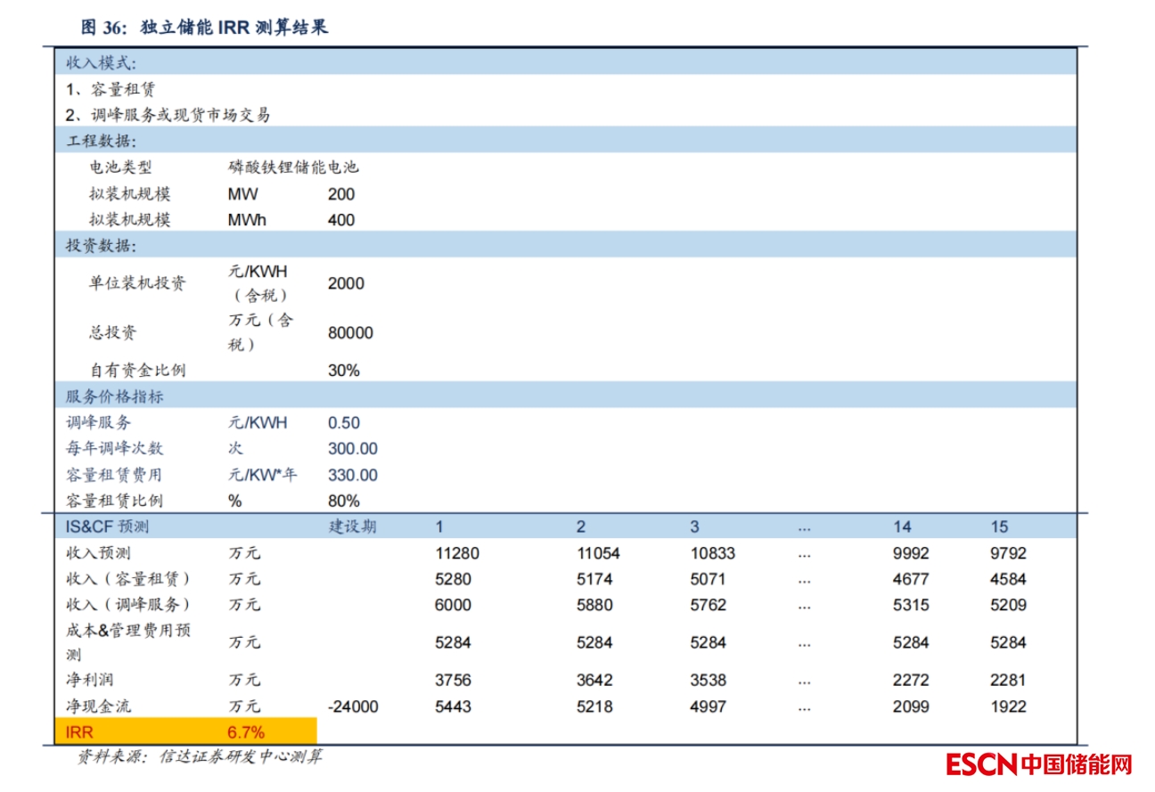 我們測算得到獨立儲能的收益率6.7%。模型核心假設如下: