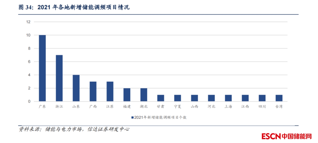調頻市場處于初期,新市場逐步開啟。儲能調頻市場的傳統(tǒng)優(yōu)勢區(qū)域為廣東、山西、京津唐、蒙西等地,而 2021 年僅在廣東有新增投運調頻儲能項目出現(xiàn),更多項目是在新的省份建設。據(jù)儲能與電力市場統(tǒng)計,2021 年,新增項目(規(guī)劃、建設、投運)涵蓋廣東、江蘇、浙江、福建等 15 個省市,涉及近 40 個項目。調頻市場正逐步開啟,新市場初期進入企業(yè)一般不多,電化學儲能的 K 值以及出清價格相對較高,因此收益較高。新市場逐步開啟,調頻市場前景廣闊。