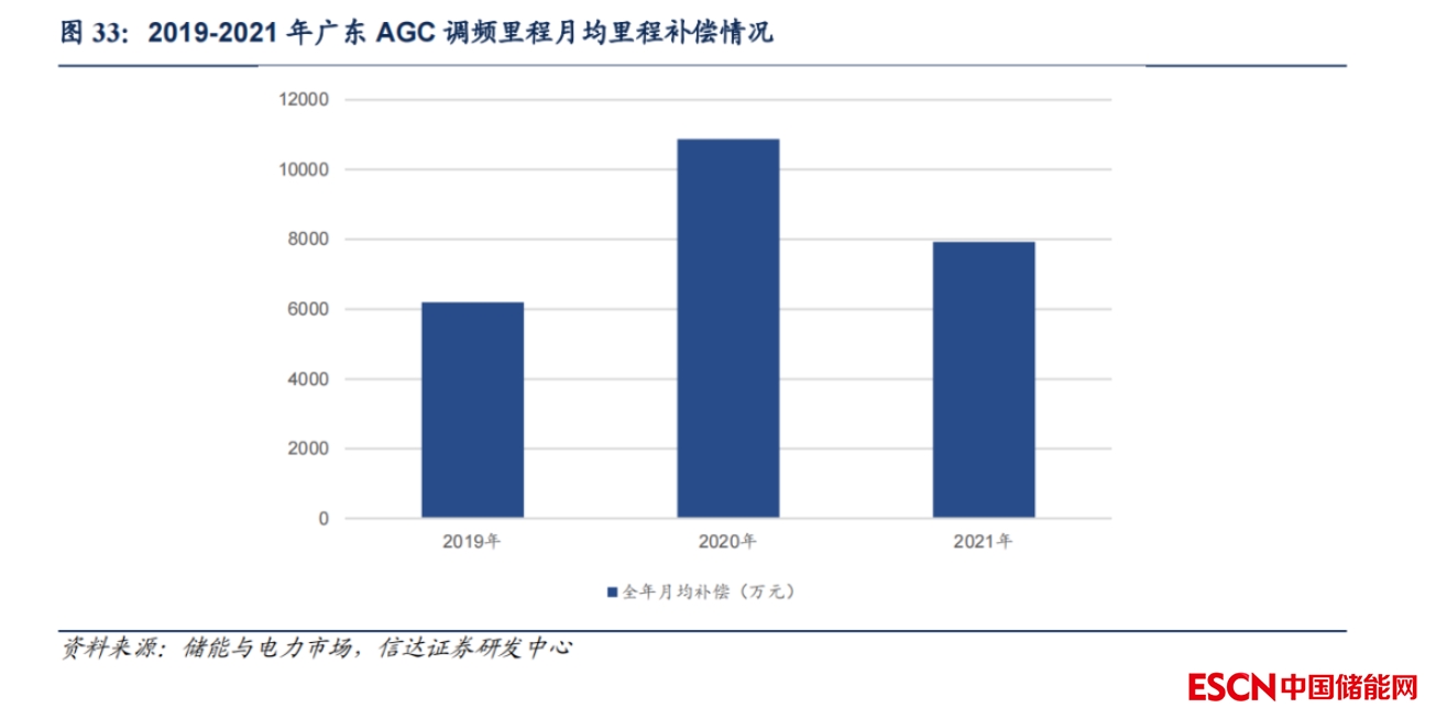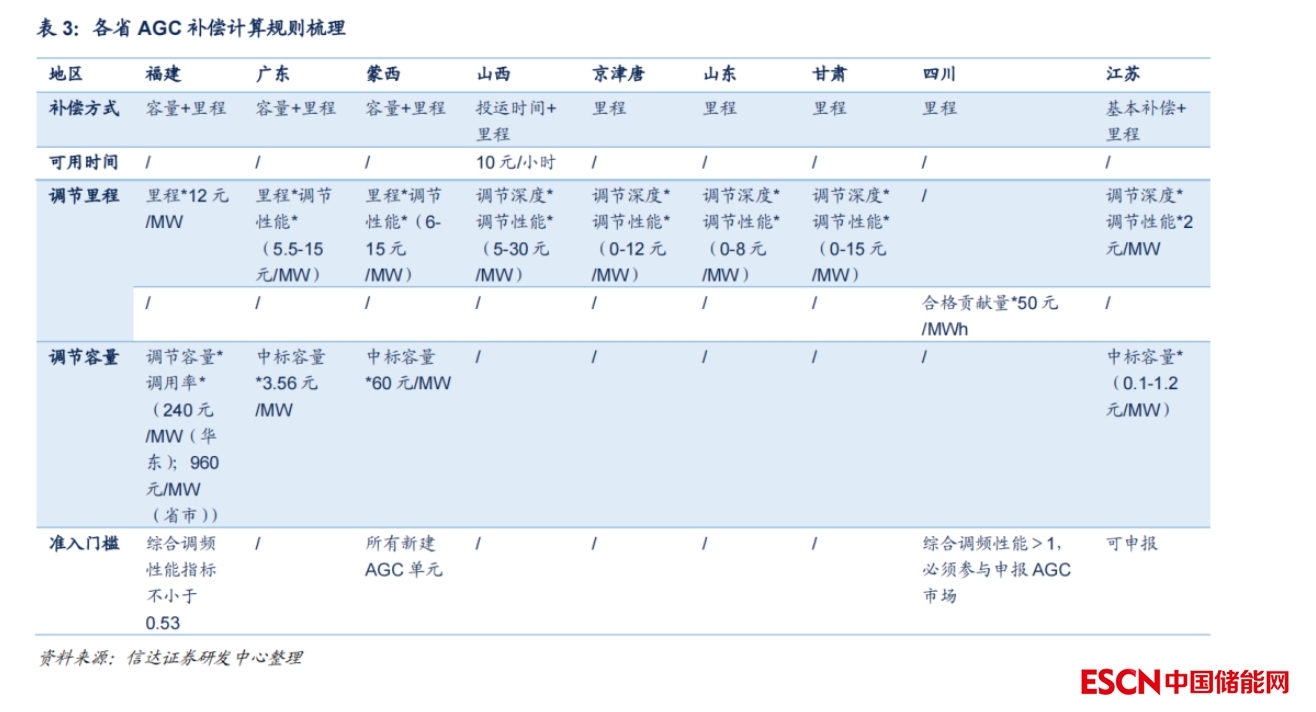 調頻儲能的收益主要來自容量補償和里程補償。根據(jù)《獨立新型儲能電站價格形成機制及成本疏導優(yōu)化方法》,1)容量補償根據(jù)儲能調頻容量定額補償,計算方式為:R 容量補償 = AGC 容量 *容量補償價格。2)里程補償按照儲能實際調用里程以市場化競價的方式補償,計算方式為:R里程補償=M調頻市場總服務費系數(shù)*MF調頻里程*K調頻性能指標*P調頻市場出清價格。其中M1一般為0-2之間,初期選1;K 值是調頻性能的綜合指標,可以分拆為K1調節(jié)速率、K2調節(jié)精度、K3響應時間三個指標。各省的K與K1、K2、K3的計算方式不一,其中一種計算方式為:K1=本臺機組實測速率/控制區(qū)域內所有AGC機組的平均調節(jié)速率;K2=1-發(fā)電單元響應延遲時間/5min;K3=1-發(fā)電單元調節(jié)誤差/發(fā)電單元調節(jié)允許誤差。K值越大,性能越好,里程補償越高。根據(jù)南方電網規(guī)則,K1最高為5,K2、K3最高為1,因此綜合指標K值最大為3。