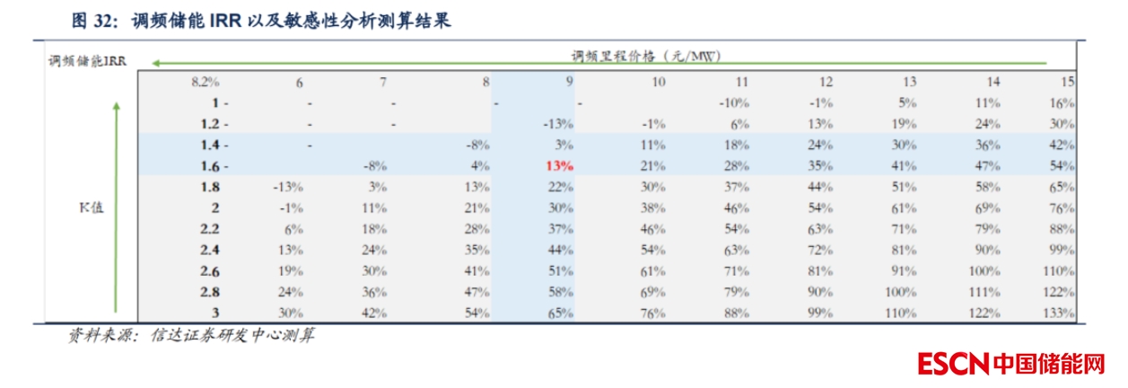 調頻儲能內部收益率對K值、里程價格敏感性極高,先發(fā)者受益,但市場演繹下易步入“紅?!薄N覀兊腒值設為1.5,實際上在調頻儲能初期,由于原來的調頻機組多為火電,電化學儲能調頻根據(jù)性能的相對優(yōu)勢,K值較大,因此收益較高。高收益促進市場新進入者增加,而新進入者一方面壓低了調頻歷程價格,另一方面提高了整體性能中樞,K值隨之下降,比如上述廣東某火儲調頻中K值提升至2.96位于行業(yè)前列,但廣東火儲調頻項目的性能的相對位置會隨著其他調頻儲能的大量建設而下降,即 K 值下降。調頻里程價格與K值雙降將使調頻儲能收益大幅下降,但已經上馬的項目不會停止運行,最后整體市場將從高收益轉為低收益“紅海”。一般來說,新市場的開啟進入者較少,電化學儲能或火儲聯(lián)調性能相對位置較高,先發(fā)者補償收入較多,收益較高。