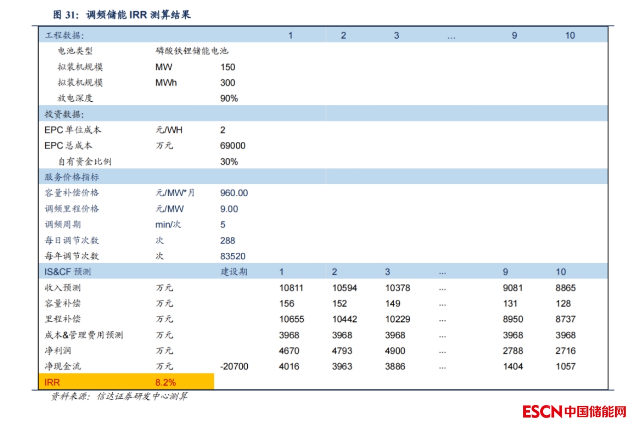 我們測算得到調頻儲能的收益率有望達到8.2%。模型核心假設如下: