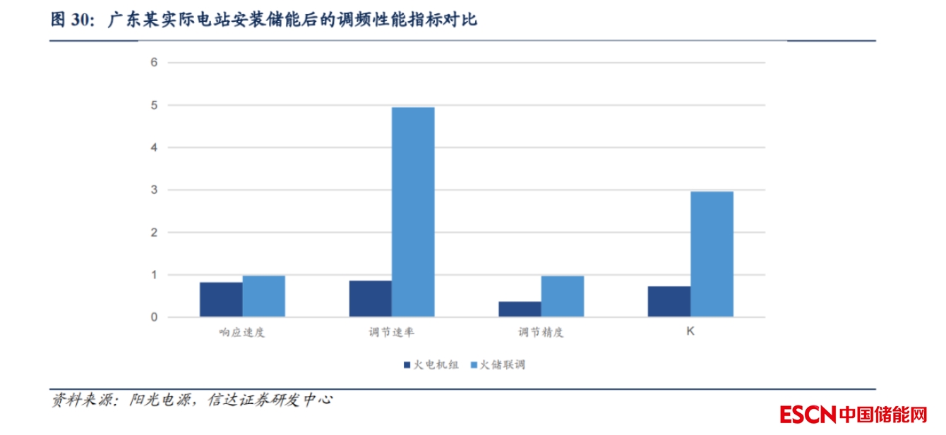 火電機組聯(lián)合儲能可以大幅提升K值,獲取更高的里程補償?;痣娬{頻的主要短板是調節(jié)速率,主要優(yōu)勢是工藝成熟,調節(jié)容量高和成本低,而電化學儲能性能優(yōu)勢明顯,因此兩者結合可以讓火電調頻的性能大大提升,從而獲得更高的里程補償。以廣東的實際電站安裝儲能前后的性能指標來看,安裝儲能后調節(jié)速率提升至4.95(+4.09),響應速度提升至0.98(+0.16),調節(jié)精度提升至0.97(+0.6),整體 K值提升至 2.96(+2.23),提升效果明顯。