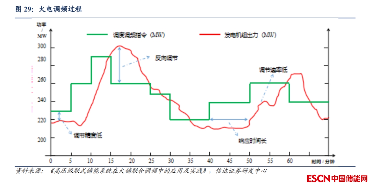 電化學儲能在二次調頻具有性能優(yōu)勢,調頻儲能需求廣闊。傳統(tǒng)火電自動發(fā)電控制(AGC)指令跟蹤性能差,存在調頻精度低、反向調節(jié)、響應時間長、調節(jié)速率低等問題。而電化學儲能具有調節(jié)速率快、調節(jié)精度高、響應時間短、可雙向調節(jié)等優(yōu)點,能完全滿足二次調頻在時間尺度內的功率變化需求,二次調頻效果顯著優(yōu)于水電機組、天然氣機組、燃煤機組。根據(jù)《電池儲能技術應用》,持續(xù)充/放電時間為15分鐘的儲能系統(tǒng),其調頻效率約為水電機組的1.4倍,燃氣機組的2.2 倍,燃煤機組的 24倍。并且隨著新能源發(fā)電占比的提升,新能源的波動對電力系統(tǒng)影響增大,電網頻率變化的容忍度越低,電網頻率變化越頻繁,因此我們認為電化學儲能調頻需求較大。