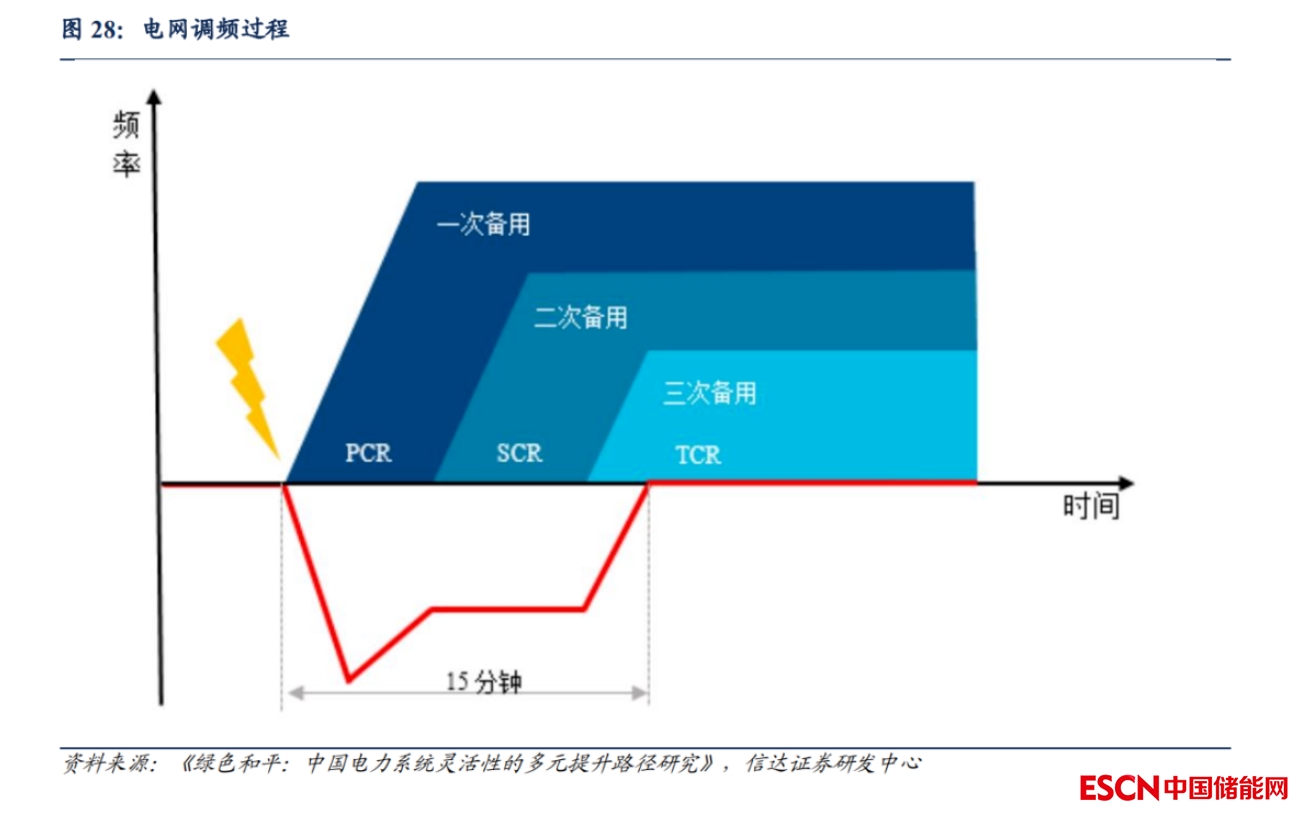 根據(jù)《綠色和平:中國電力系統(tǒng)靈活性的多元提升路徑研究》,調頻分為一次調頻、二次調頻和三次調頻。當電網受到負荷沖擊或新能源波動沖擊時,電頻波動較大超出電網安全范圍,這時需要調頻輔助幫助電網頻率穩(wěn)定。調頻資源可以分為三種:一次、二次、三次控制備用,分別對應一次、二次、三次調頻。