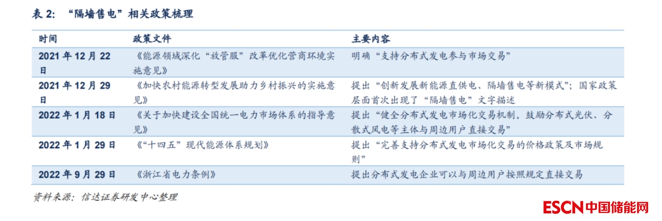“隔墻售電”有望促成用戶側共享儲能模式,推動工商業(yè)儲能規(guī)模發(fā)展?!案魤κ垭姟奔捶植际桨l(fā)電項目就近交易,“隔墻售電”允許分布式能源項目通過配電網直接將電力銷售給周邊的用戶側,這個過程少了電網參與,減少了中間成本。2021 年年底以來,“隔墻售電”作為高頻詞匯多次出現(xiàn)在國家重要政策文件中。分布式電源“隔墻售電”模式對于用戶側來說,臨近工商業(yè)或工業(yè)園區(qū)可以認為是一個整體,利于儲能的大型化降本;對于投資方來說,大型化用戶側儲能有望拓展商業(yè)模式,從而提升經濟性;對于電網來說,大型儲能有可能成為可以調用的靈活性資源。我們認為未來隨著“隔墻售電”政策不斷完善,逐步落地,工商業(yè)儲能有望規(guī)模發(fā)展。