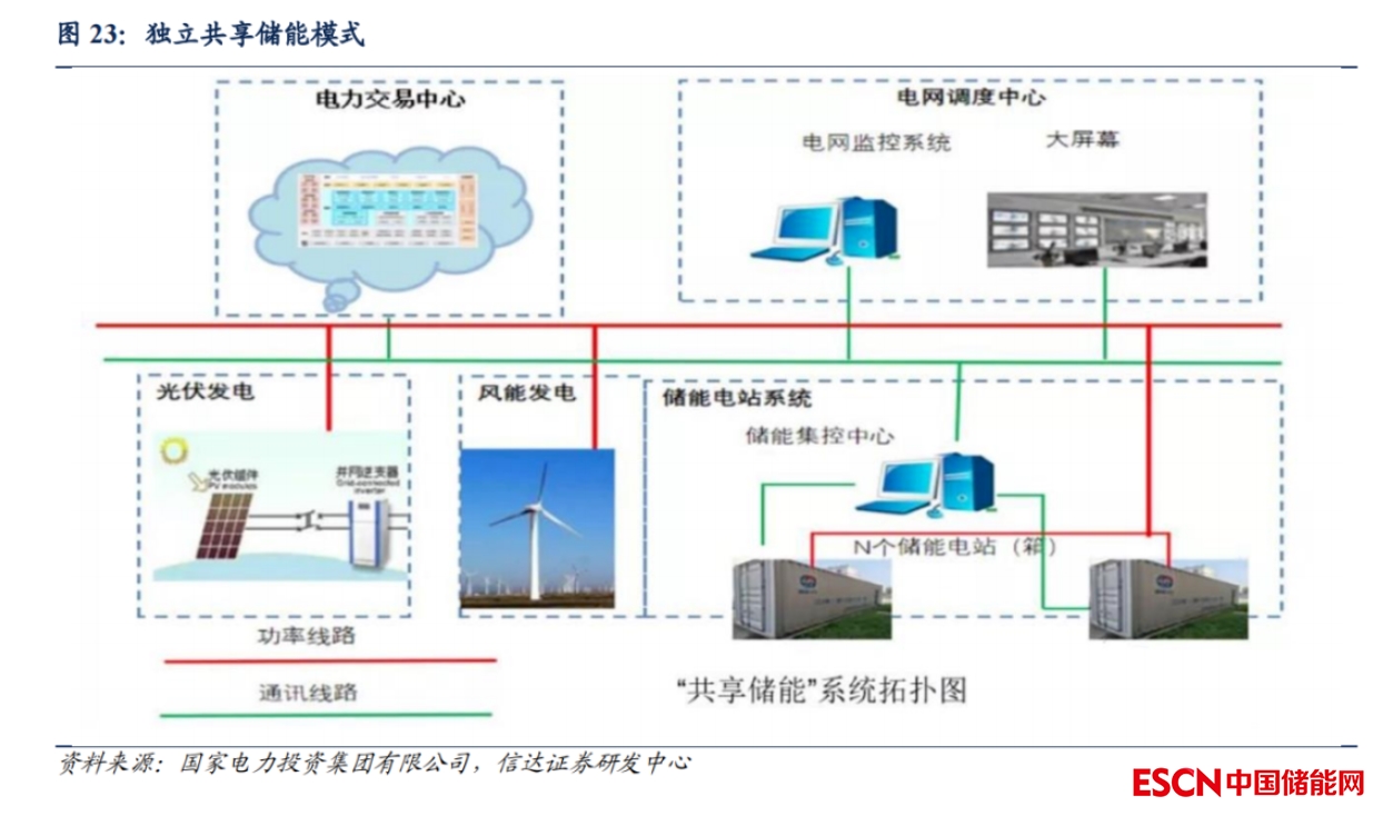 共享儲能成為新能源配儲的折中方案。共享儲能是由第三方投資者建大型獨立儲能項目,新能源項目投資方可以通過租賃獨立儲能的部分容量來滿足政策強配要求,每年付獨立儲能一定的租賃費。對于新能源項目投資方來說,容量租賃費用每年支付,減少了初始投資巨大的現(xiàn)金流壓力;對于共享儲能投資方來說,獨立儲能電站的收益模式更多,投資回報率更高。因此租賃共享儲能的模式成為新能源項目滿足政策強配要求的趨勢。