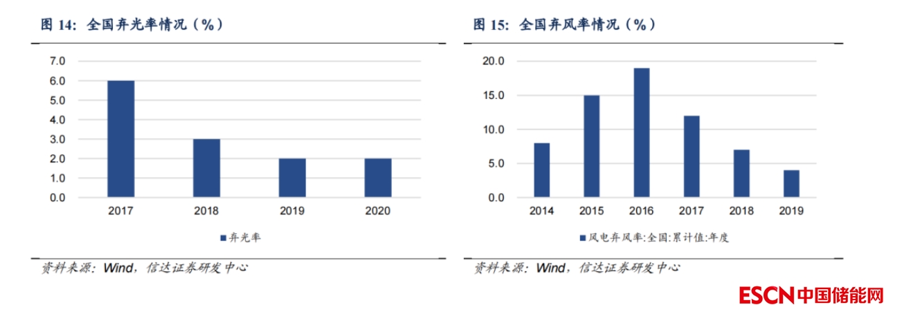 全國新能源消納壓力整體得到改善?!笆濉背跗?,全國新能源消納壓力較大,整體棄風棄光率較高,其中棄風率201年達19%,隨后我國重視新型電力系統(tǒng)建設,解決新能源消納能力,棄風棄光率得到明顯改善。