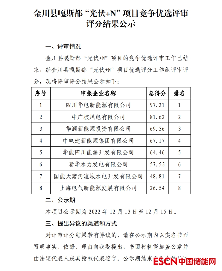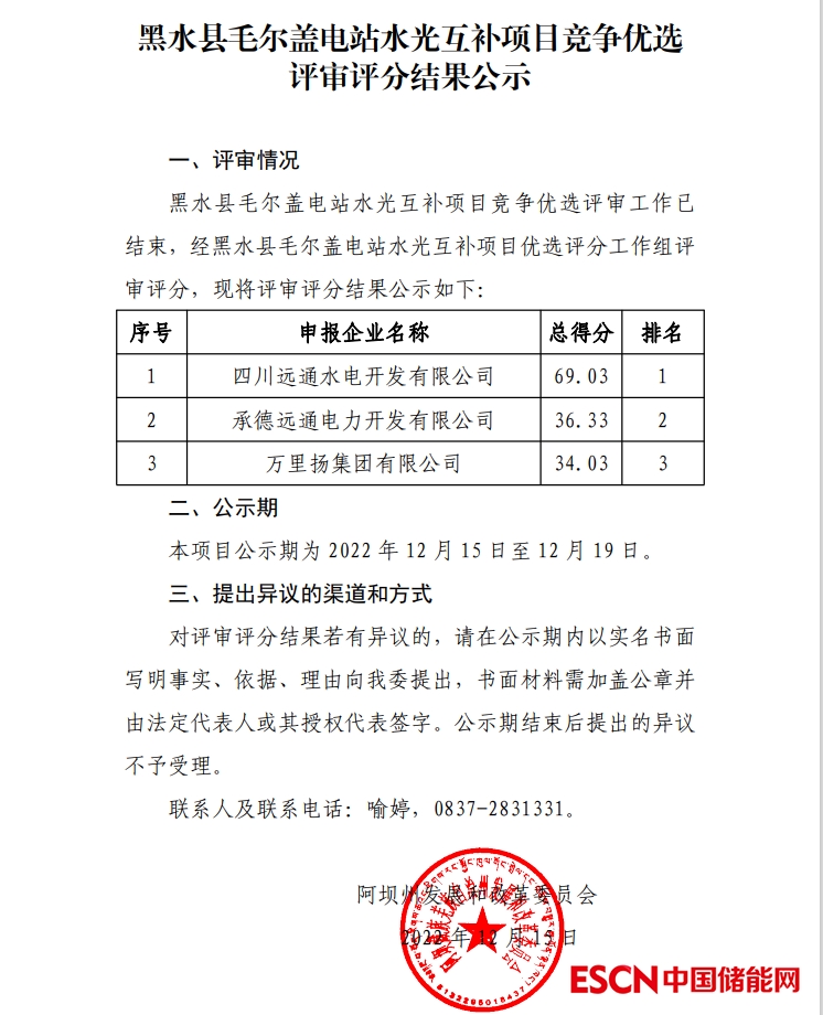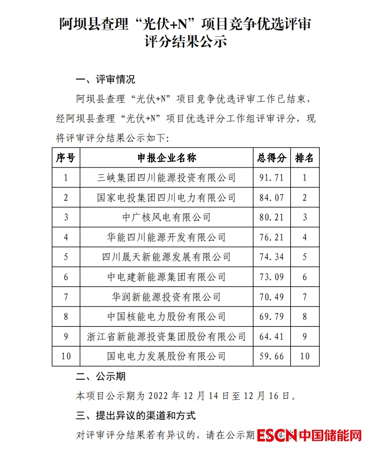 中國(guó)儲(chǔ)能網(wǎng)訊:近日,四川阿壩州公共資源交易網(wǎng)發(fā)布阿壩縣查理“光伏+N”、金川縣嘎斯都“光伏+N”以及黑水縣毛爾蓋電站水光互補(bǔ)項(xiàng)目競(jìng)爭(zhēng)優(yōu)選結(jié)果。共計(jì)17家企業(yè)參與投標(biāo),預(yù)計(jì)三峽、華電、四川遠(yuǎn)通水電擬中標(biāo)。