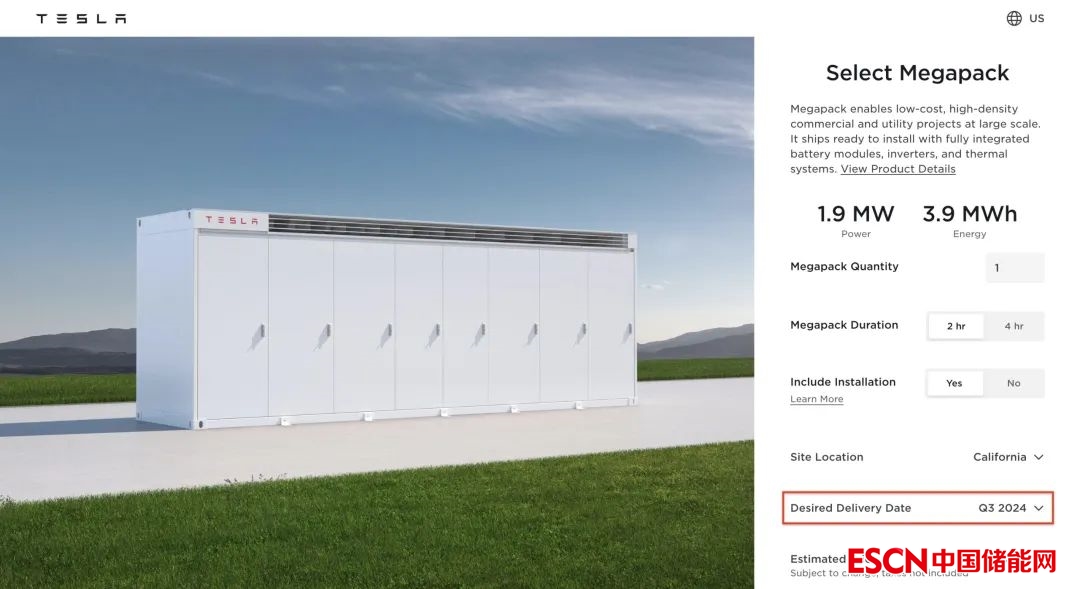 中國儲(chǔ)能網(wǎng)訊:近日,特斯拉官方網(wǎng)站顯示,其電池儲(chǔ)能系統(tǒng)Megapack訂單的最早預(yù)計(jì)交付日期將在2024年第三季度。