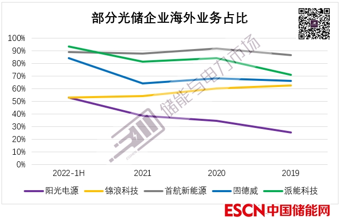 以派能、錦浪、固德威等為代表的傳統(tǒng)深耕戶用儲(chǔ)能和分布式光伏逆變器的企業(yè)自然當(dāng)仁不讓?zhuān)娂娮プ〗璧缿粲脙?chǔ)能電池和逆變器的機(jī)會(huì)實(shí)現(xiàn)新的業(yè)績(jī)?cè)鲩L(zhǎng),其海外業(yè)務(wù)占比已經(jīng)超過(guò)80%。