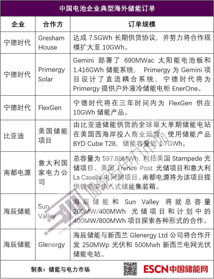 寧德時(shí)代無(wú)疑成為國(guó)內(nèi)電池企業(yè)海外簽單的大戶。根據(jù)儲(chǔ)能與電力市場(chǎng)的追蹤,僅已公布的FlexGen、Broad Reach Power、Primergy Solar、Gresham House等幾個(gè)客戶的項(xiàng)目采購(gòu)和長(zhǎng)期訂單就超過(guò)22GWh。此外,比亞迪、海辰、國(guó)軒高科、南都電源、雙一力等企業(yè)也在美國(guó)、澳大利亞、新西蘭等市場(chǎng)多有斬獲,并且有多個(gè)訂單規(guī)模都超過(guò)了500MWh。