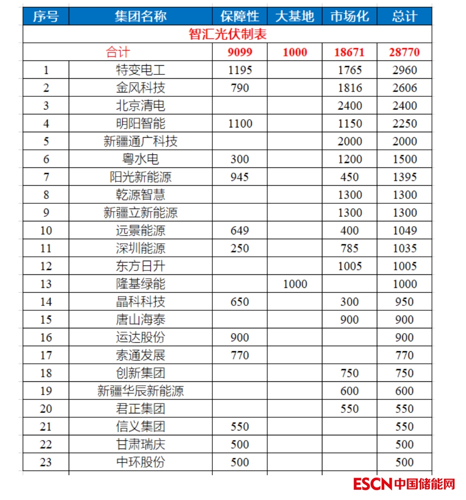 廣東能源集團、陜煤化工、湖北能源集團、太原重型機械集團,均獲得超過1GW的項目。其他企業(yè)情況如下表所示。