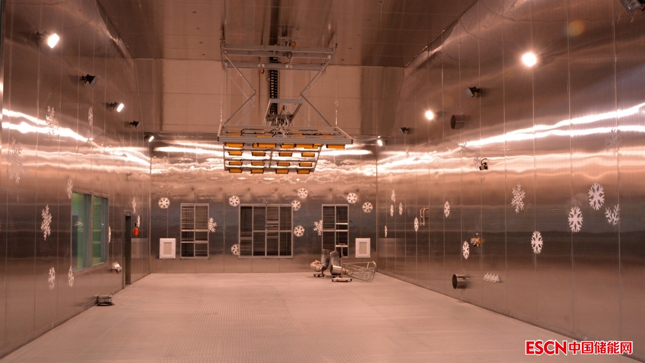 坐落在常州同一個(gè)工業(yè)園的熱環(huán)境實(shí)驗(yàn)艙總?cè)莘e為880立方米(20x8x5.5m 長(zhǎng)x寬x高),為國(guó)內(nèi)最大的單體熱管理系統(tǒng)測(cè)試設(shè)施,可以裝載整個(gè)40英尺的集裝箱儲(chǔ)能機(jī)組,準(zhǔn)確控制-40至+60℃的內(nèi)部環(huán)境溫度,模擬嚴(yán)苛的戶外環(huán)境條件,測(cè)試電池環(huán)境的控制效果,電池組在高溫時(shí)的安全,在寒冬時(shí)的衰減和表現(xiàn)。