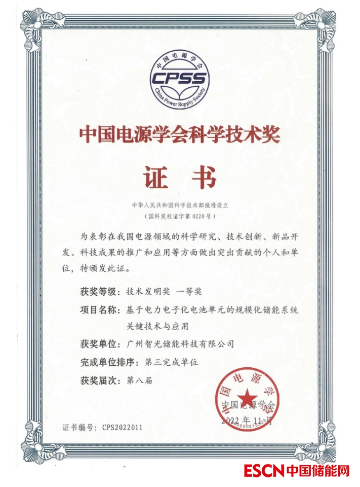 2、2022年11月,智光儲能參與的《基于電力電子化電池單元的規(guī)?;瘍δ芟到y(tǒng)關(guān)鍵技術(shù)與應(yīng)用》獲得第八屆中國電源學(xué)會科學(xué)技術(shù)一等獎。