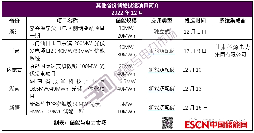 浙江、甘肅、內(nèi)蒙古等地12月投運項目如下表所示。