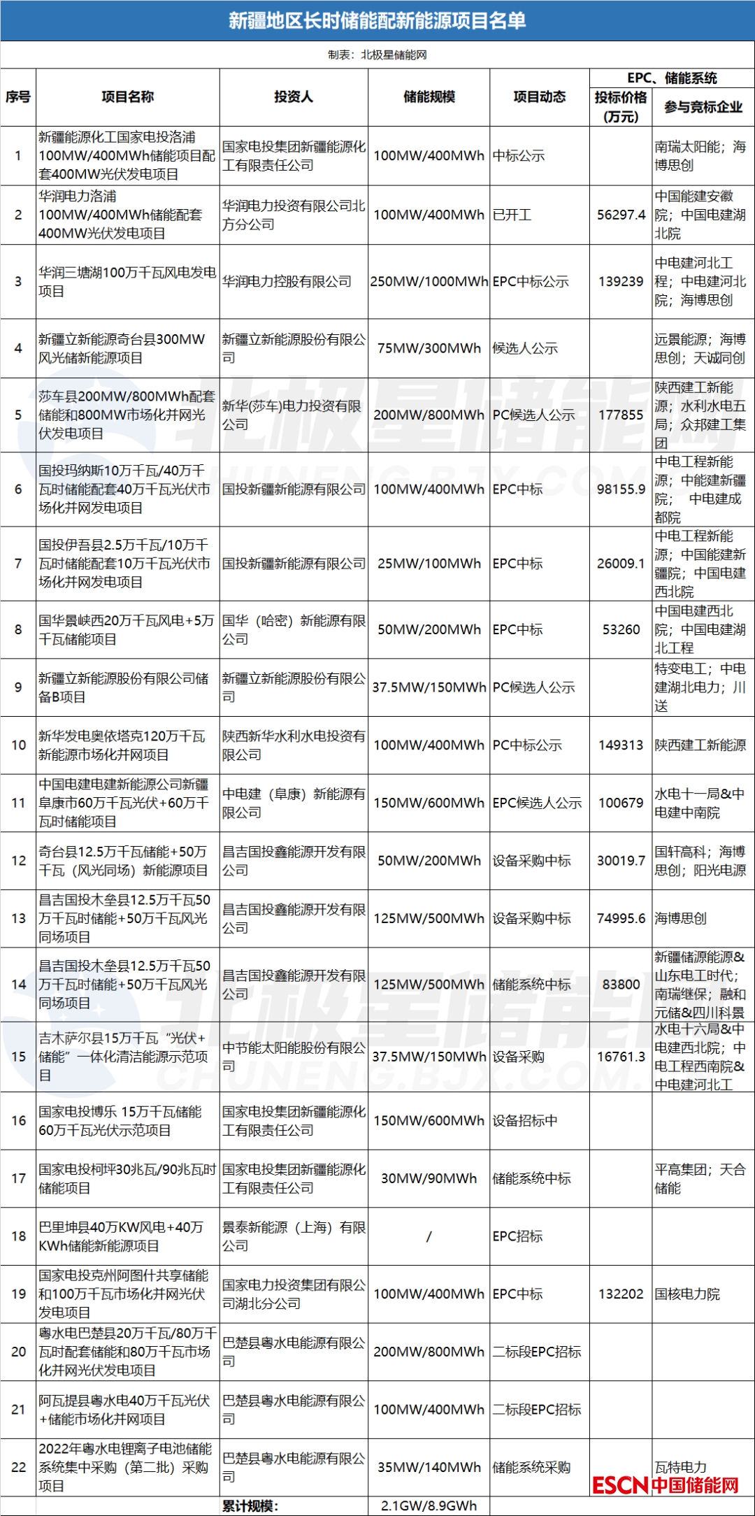 據(jù)不完全統(tǒng)計(jì),今年以來,新疆地區(qū)已進(jìn)行設(shè)備采購(gòu)、EPC招標(biāo)開標(biāo)的長(zhǎng)時(shí)儲(chǔ)能項(xiàng)目累計(jì)規(guī)模已達(dá)到2.1GW/8.9GWh,儲(chǔ)能時(shí)長(zhǎng)主要以4小時(shí)為主,項(xiàng)目投資主體主要來自國(guó)家電投、華潤(rùn)集團(tuán)、中核集團(tuán)、國(guó)家能源集團(tuán)、粵水電等企業(yè)。