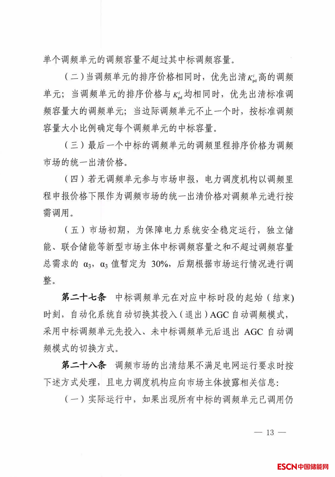 中標(biāo)調(diào)頻單元的調(diào)頻容量不超過其標(biāo)準(zhǔn)調(diào)頻容量。而標(biāo)準(zhǔn)調(diào)頻容量方面,儲能也有限制,儲能、聯(lián)合儲能的標(biāo)準(zhǔn)調(diào)節(jié)容量將不超過額定容量的10%,進(jìn)一步限制了儲能參與市場的總量。