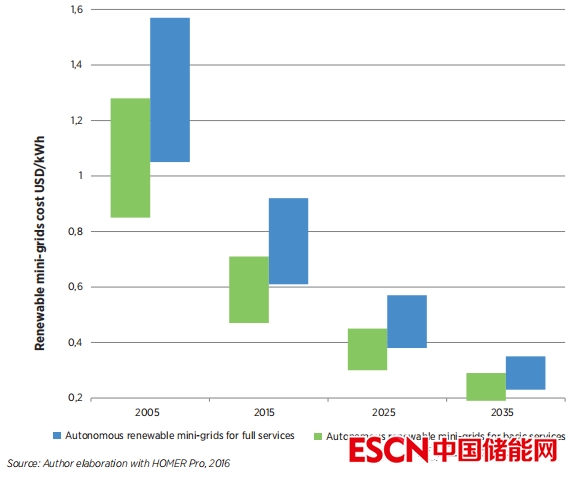 互聯(lián)可再生微型電網(wǎng)的成本降低將受到互聯(lián)主電網(wǎng)的經(jīng)濟效益的影響,但可以應(yīng)用自主電網(wǎng)的主要成本趨勢。