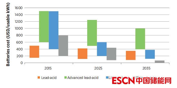 圖S2:到2015年、2025年和2035年,鉛酸、先進鉛酸、鋰離子和流式蓄電池的預(yù)期成本下降
