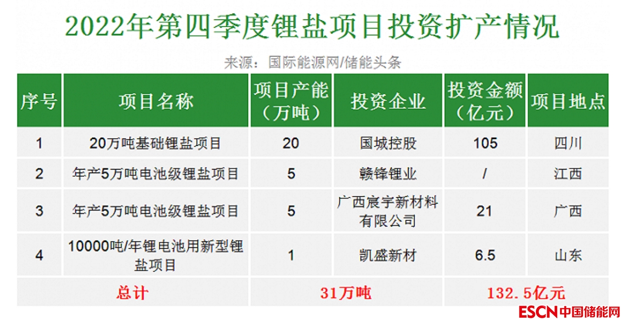 據(jù)國際能源網(wǎng)/儲能頭條統(tǒng)計,今年第四季度以來包括國城控股、贛鋒鋰業(yè)、凱盛新材等企業(yè)合計投資超132.5億元擴產(chǎn)鋰鹽項目,產(chǎn)能達31萬噸。