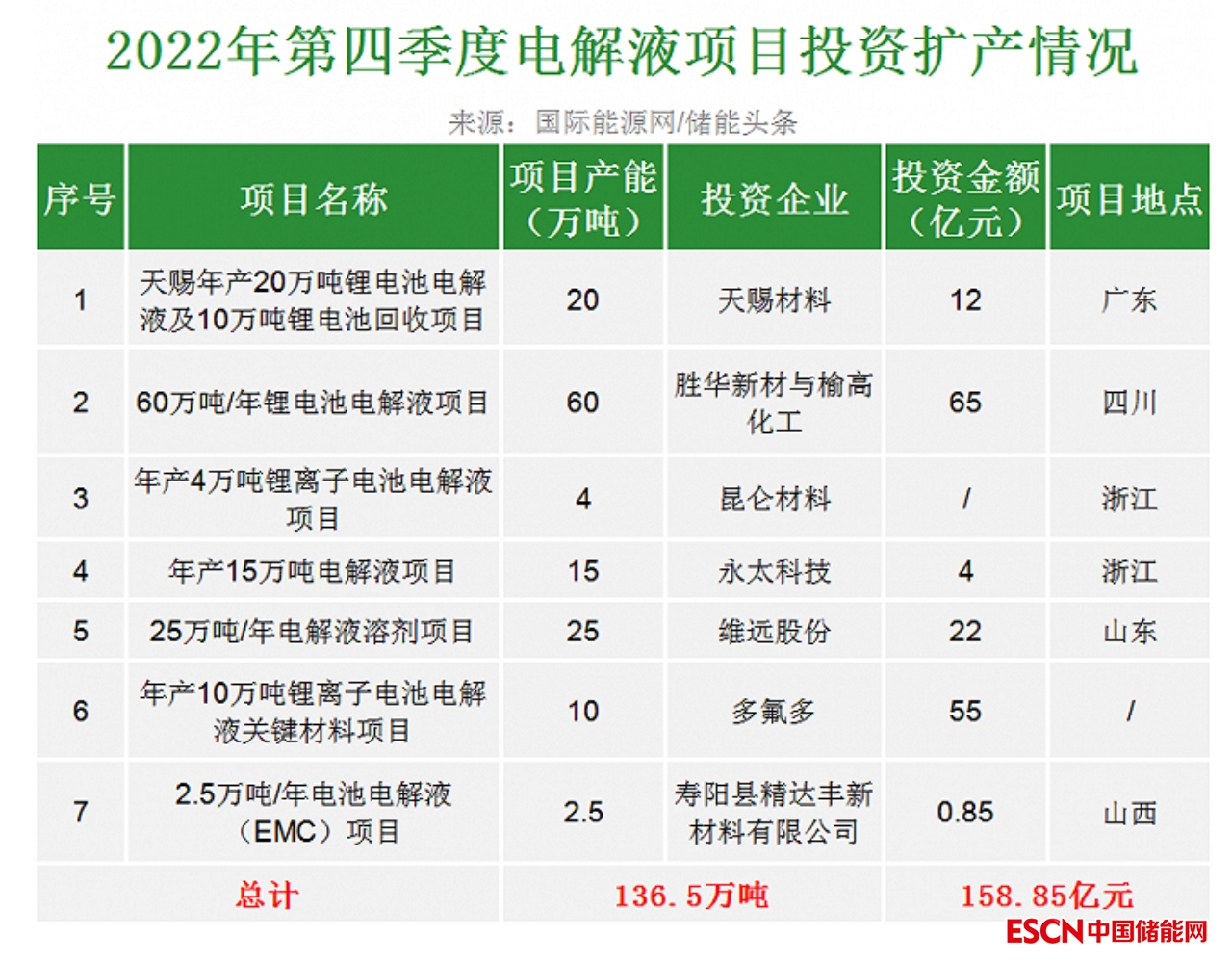 今年第四季度,電解液龍頭企業(yè)永太科技、多氟多、天賜材料的擴產(chǎn)步伐加快。據(jù)國際能源網(wǎng)/儲能頭條(chuneng365)統(tǒng)計,今年第四季度合計投資超158.85億元擴產(chǎn)電解液項目,最終產(chǎn)能達136.5萬噸。