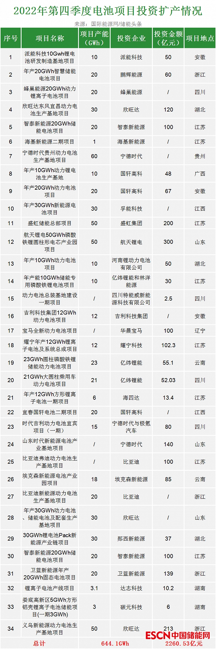 據(jù)統(tǒng)計,2022年第四季度,以派能科技、鵬輝能源、寧德時代、國軒高科、億緯鋰能等為代表的鋰電池企業(yè)相繼公布了多個新投建項目,整體投建資金超2260.53億元,建設(shè)年產(chǎn)能達644.1GWh(部分項目未披露投資金額及產(chǎn)能),較去年同期擴產(chǎn)能步子邁的更大。