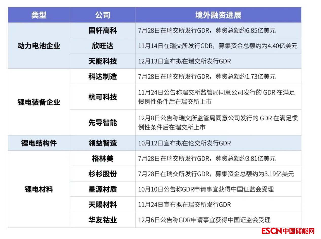 據(jù)不完全統(tǒng)計(jì),目前已有國(guó)軒高科、欣旺達(dá)、格林美、杉杉股份、科達(dá)制造5家公司通過(guò)發(fā)行全球存托憑證(GDR)獲得海外資本投資。國(guó)軒高科為國(guó)內(nèi)首家赴海外發(fā)行GDR并在瑞士上市的中國(guó)動(dòng)力電池企業(yè)。另外還有星源材質(zhì)、杭可科技等7家企業(yè)仍在申請(qǐng)發(fā)行GDR的進(jìn)程中。