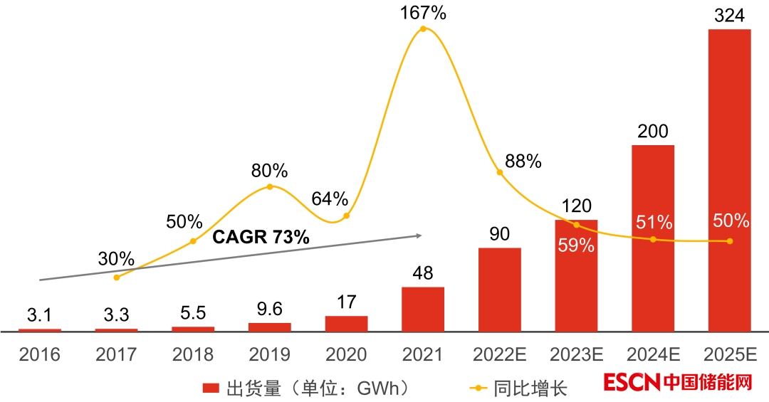 2016-2025年中國儲能鋰電池出貨量及預(yù)測