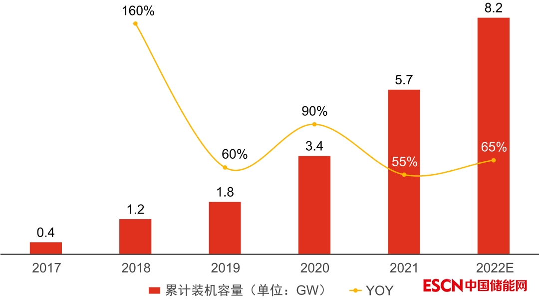2017-2022E年中國電化學(xué)儲能累計裝機容量及增速