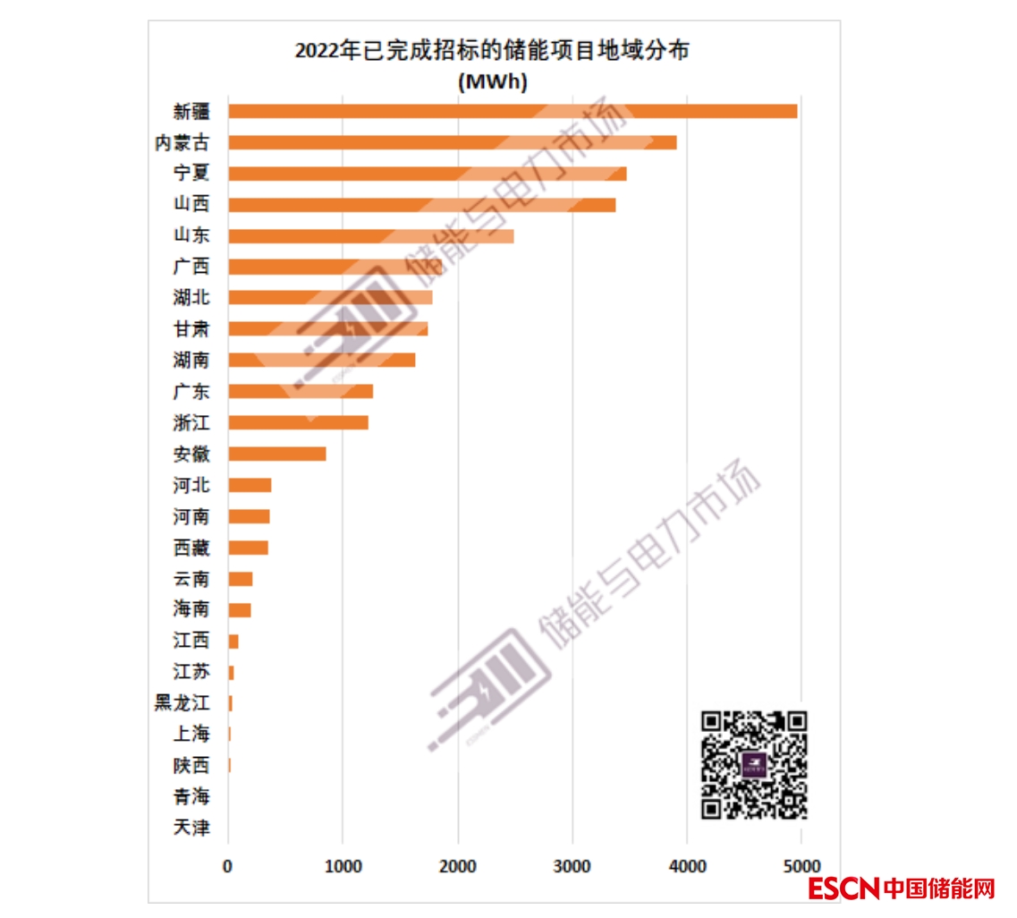 除集采等項目實施地點尚不明確的項目之外,2022年已完成招標的項目共計分布在24個省市自治區(qū)。其中新疆、內(nèi)蒙古、寧夏、山西、山東五地的規(guī)模尤為突出,都超過了2GWh。
