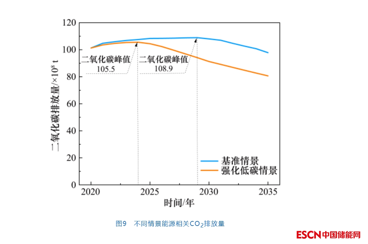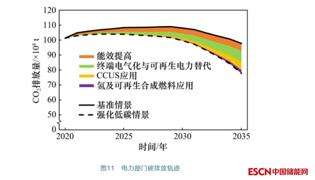 電力低碳轉(zhuǎn)型對“雙碳”目標(biāo)的實(shí)現(xiàn)具有全局性意義??紤]不同外部因素的作用大小,預(yù)計(jì)2035年全社會用電量將從2021年的8.31×1012 kW·h提高到9.8×1012 kW·h(基準(zhǔn)情景)~1.22×1013 kW·h(強(qiáng)化低碳情景)。這主要?dú)w因于電氣化的快速發(fā)展,包括電力替代煤炭、石油等化石能源直接燃燒和利用,或以可再生電力等制氫,以及終端部門電氣化的強(qiáng)化等。電源結(jié)構(gòu)整體呈現(xiàn)清潔化發(fā)展的態(tài)勢,煤電裝機(jī)量和發(fā)電量占比不斷下降,非化石能源裝機(jī)和發(fā)電量的占比穩(wěn)步提升。電源總裝機(jī)從2020年的2.2×109 kW增加至2035年的3.6×109 kW,增加了64.0%。煤電裝機(jī)總量下降至1×109 kW以下,相較2020年下降9.6%。氣電裝機(jī)總量超過2×108 kW,相較2020年增加122.5%。可再生電力裝機(jī)合計(jì)超過2.1×109 kW,是2020年的2.4倍。發(fā)電總量從2020年的7.6×1012 kW·h提高至1.27×1013 kW·h,增加了66.3%。其中,來自風(fēng)能、太陽能的可再生電力發(fā)電量增加了近5倍,氣電發(fā)電量增加了1.9倍,核電發(fā)電量增加了2.4倍。從碳排放來看,電力系統(tǒng)碳排放預(yù)計(jì)在2025—2030年達(dá)峰,達(dá)峰后進(jìn)入短暫平臺期,然后開始下降(見圖11)。電力系統(tǒng)的清潔化和低碳化將對全社會的碳排放下降帶來實(shí)質(zhì)性貢獻(xiàn)。