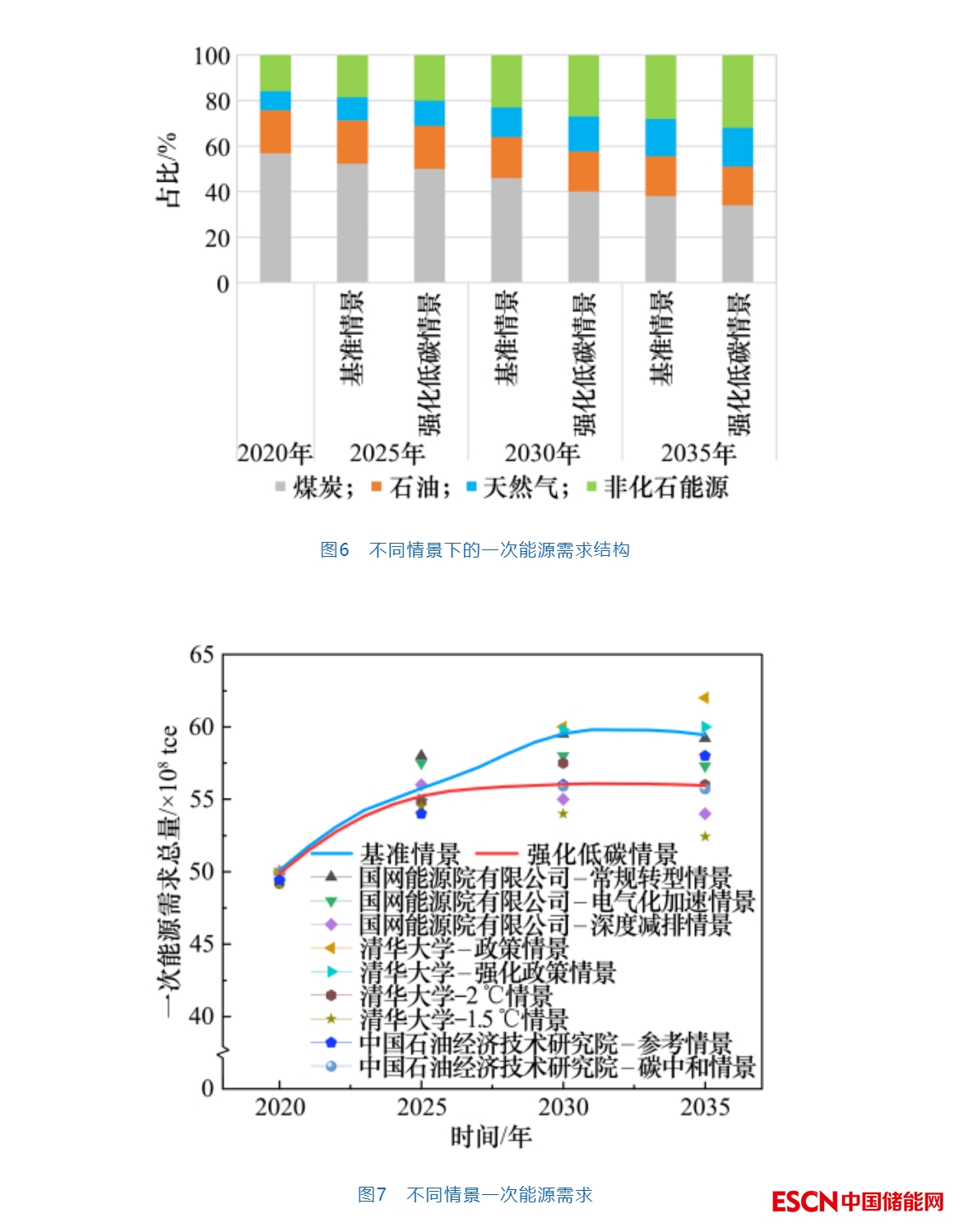 從未來能源消費(fèi)格局看,能源消費(fèi)的主要部門依然是以工業(yè)為主。2020年,我國終端能源消費(fèi)總量約為3.234×109 tce(扣除用作原料、材料的能源,按電熱當(dāng)量計(jì)算),其中,工業(yè)用能占比約為62.5%。2035年,終端能源消費(fèi)總量將進(jìn)一步提升至3.527×109 tce(扣除用作原料、材料的終端能源消費(fèi)),其中工業(yè)用能占能源消費(fèi)總量的比例約為53.5%(見圖5)。終端用能結(jié)構(gòu)也將發(fā)生顯著變化,電氣化的比例將進(jìn)一步提高。例如,2035年工業(yè)部門的電氣化比例可達(dá)到37%以上,交通運(yùn)輸?shù)碾姎饣壤稍黾拥?2%以上,建筑部門電氣化水平可達(dá)到54%。在碳中和目標(biāo)的推動下,終端電氣化進(jìn)程還將不斷推進(jìn)。2035年前,我國能源需求總量仍將持續(xù)增長(見圖6)。2020年至2025年,一次能源需求總量的年均增長速度為2.1%~2.3%?;鶞?zhǔn)情景下,我國一次能源需求總量在2025年將達(dá)到5.57×109 tce,2035年達(dá)到5.96×109 tce。強(qiáng)化低碳情景下,2025年我國一次能源需求總量為5.52×109 tce,2035年約為5.56×109 tce(見圖7)?;鶞?zhǔn)情景下能源需求總量大約在2030年達(dá)峰。在強(qiáng)有力的政策支持和技術(shù)促進(jìn)下,我國能源需求總量有望在2030年前達(dá)到峰值然后開始下降,從而為碳中和的實(shí)現(xiàn)留出空間。由于方法設(shè)計(jì)、情景設(shè)置、政策環(huán)境、技術(shù)發(fā)展等方面的不同研判,已有研究對未來能源需求總量判斷呈現(xiàn)差異,但這些研究證實(shí)了同樣的趨勢,即能源需求總量增速將放緩。