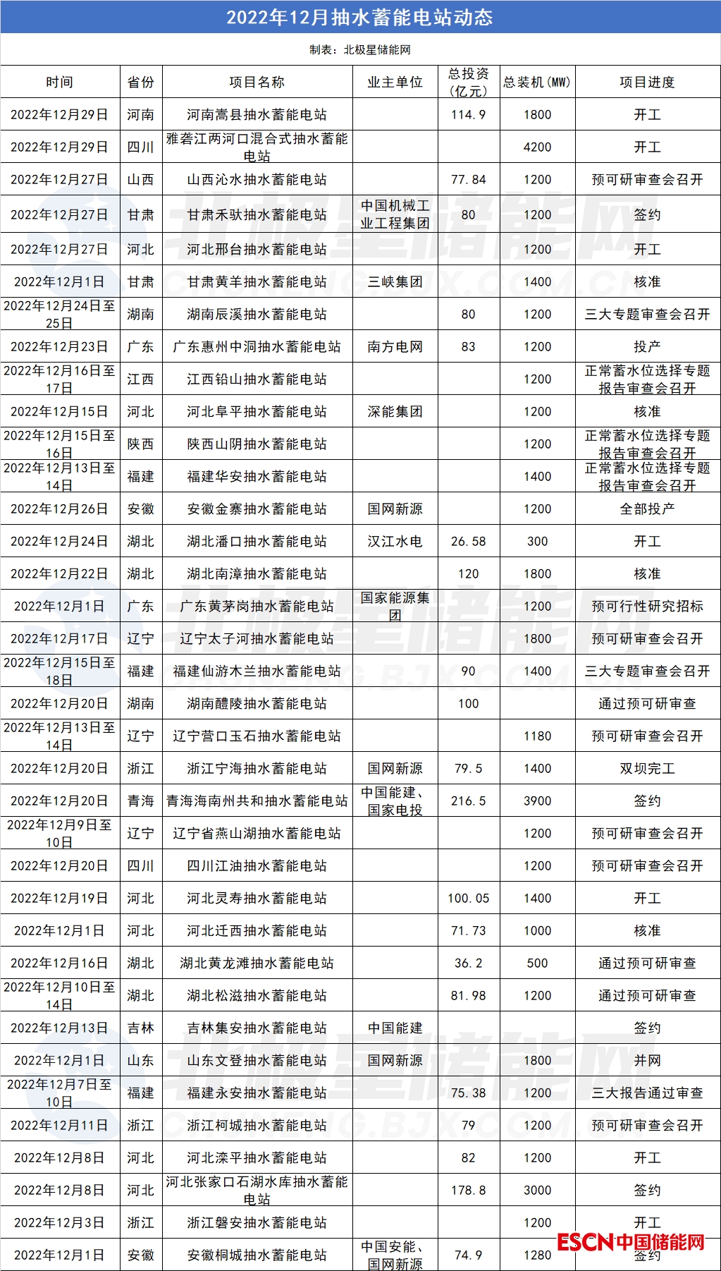 中國儲能網訊:據不完全統(tǒng)計,2022年12月共有36個總裝機容量49960MW的抽水蓄能電站啟動預可研審查、核準、開工、投產等。