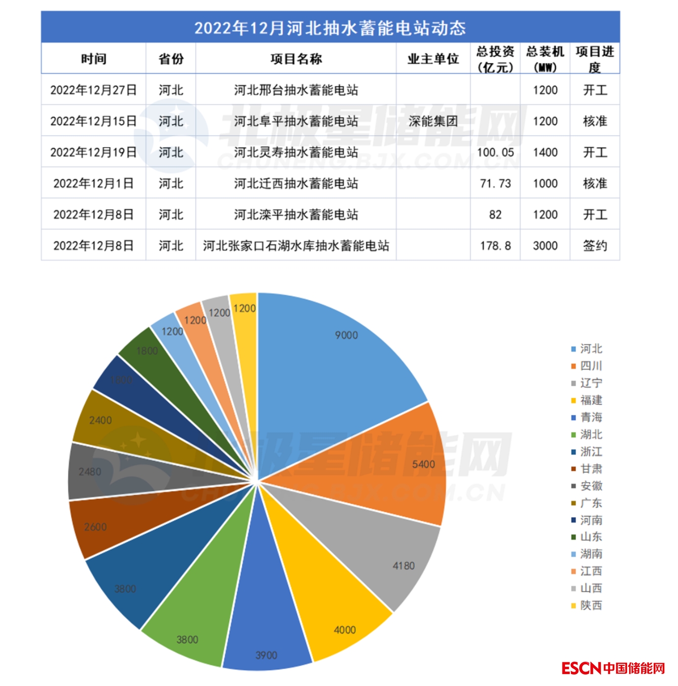 在全國各省份來看,河北在2022年12月抽水蓄能電站更新動態(tài)最多,共6個抽水蓄能項目9000MW。