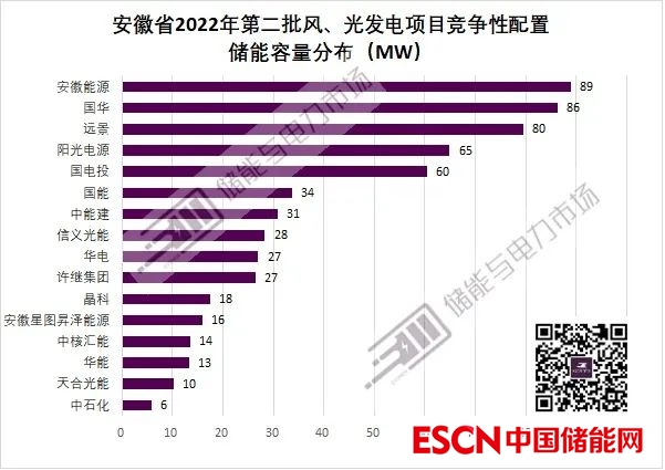 簡(jiǎn)單以每個(gè)項(xiàng)目按平均值(光伏13.5%,風(fēng)電26.5%)進(jìn)行儲(chǔ)能配置進(jìn)行計(jì)算,則安徽省能源集團(tuán)有限公司可能對(duì)儲(chǔ)能需求最大,為89MW,其次為國(guó)華,86MW。如下圖所示。
