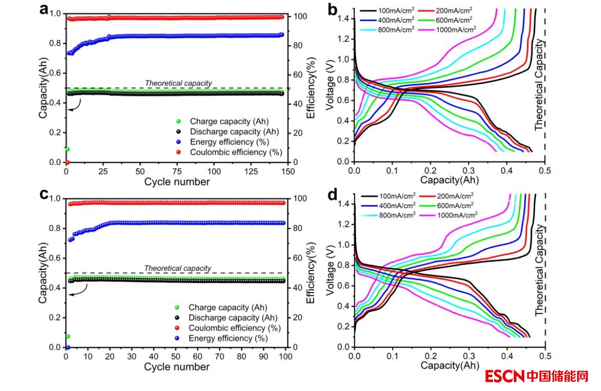 最終篩選出的Li||Sb20Bi60Sn10Pb10和Li||Sb50Bi30Sn10Pb10液態(tài)金屬電池具有綜合優(yōu)異的性能,并通過0.5 Ah級別液態(tài)金屬電池進(jìn)行測試驗(yàn)證,如圖2所示。Li||Sb20Bi60Sn10Pb10電池在500℃運(yùn)行溫度下以100 mA cm-2穩(wěn)定運(yùn)行150循環(huán),平均放電容量為0.47 Ah,庫倫效率為99%,能量效率為87%,放電能量可達(dá)0.28Wh,即使在大電流密度下(1000 mA cm-2),其能量效率也接近60%,具有優(yōu)異的電化學(xué)性能。而Li||Sb50Bi30Sn10Pb10電池則具有最高的能量密度(~280 Wh/kg)和最低的成本(~70 $/kWh),其庫倫效率為98%,且在大電流密度下(1000 mA cm-2),其容量保持率依舊高達(dá)90%。