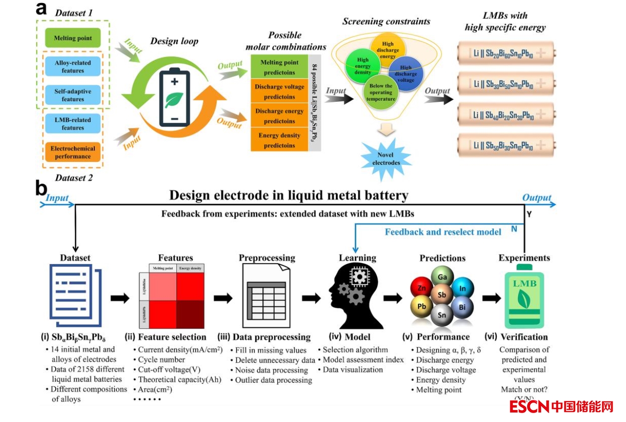 該成果以《機(jī)器學(xué)習(xí)加速設(shè)計(jì)液態(tài)金屬電池電極材料》(Accelerated design of electrodes for liquid metal battery by machine learning)為題發(fā)表于《儲能材料》(Energy Storage Materials, IF=20.831)。西安交通大學(xué)金屬材料強(qiáng)度國家重點(diǎn)實(shí)驗(yàn)室材料創(chuàng)新中心(CAID)為論文的唯一通訊單位,寧曉輝教授為論文的通訊作者,碩士生周涵為論文的第一作者。此研究得到國家自然科學(xué)基金委(51874228)、國家重點(diǎn)研發(fā)計(jì)劃(2018YFB0905600)及王寬城教育基金的資助支持。