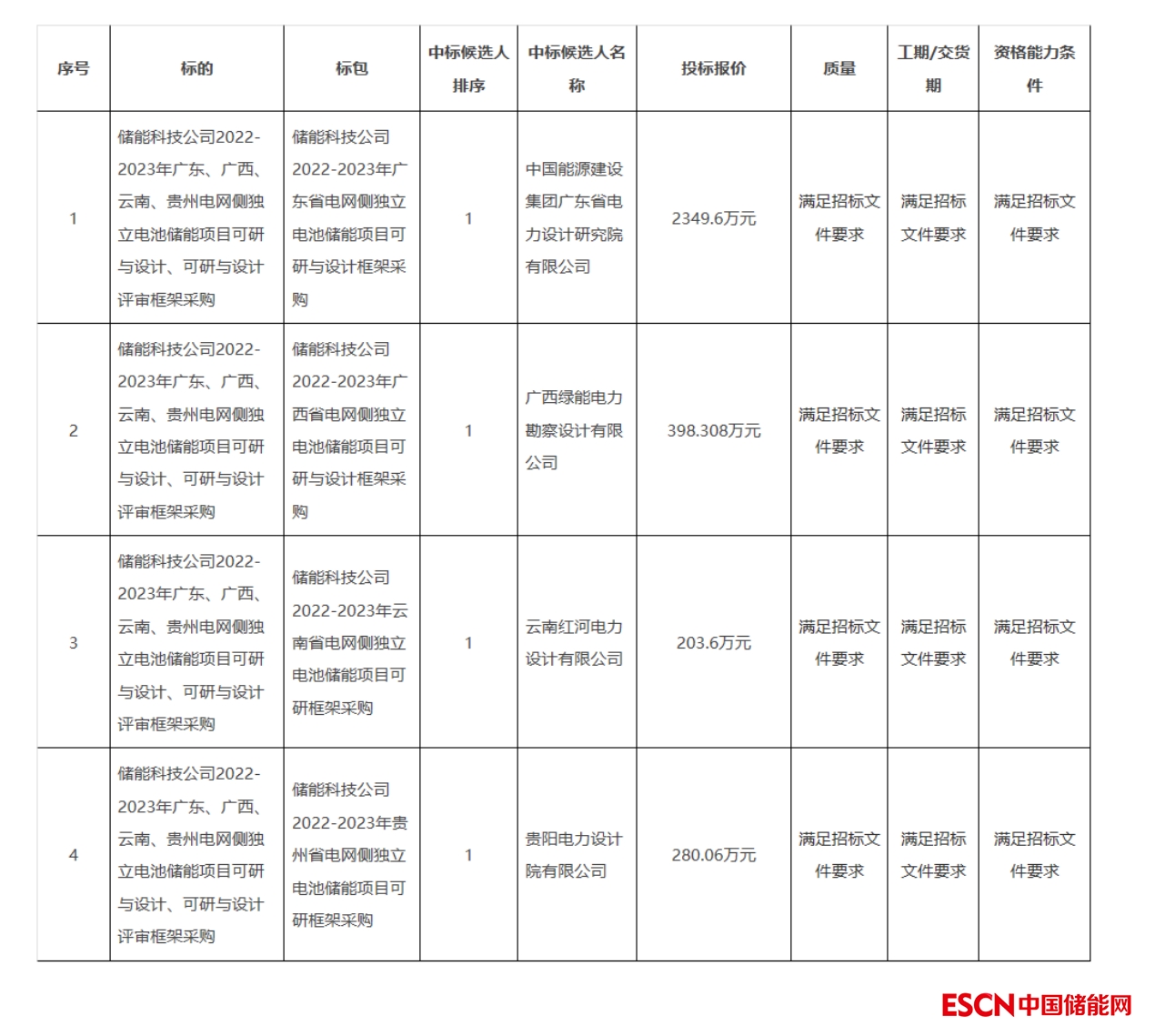 中國(guó)儲(chǔ)能網(wǎng)訊:1月12日,南方電網(wǎng)儲(chǔ)能科技公司2022-2023年廣東、廣西、云南、貴州電網(wǎng)側(cè)獨(dú)立電池儲(chǔ)能項(xiàng)目可研與設(shè)計(jì)、可研與設(shè)計(jì)評(píng)審框架采購(gòu)中標(biāo)候選人公示。