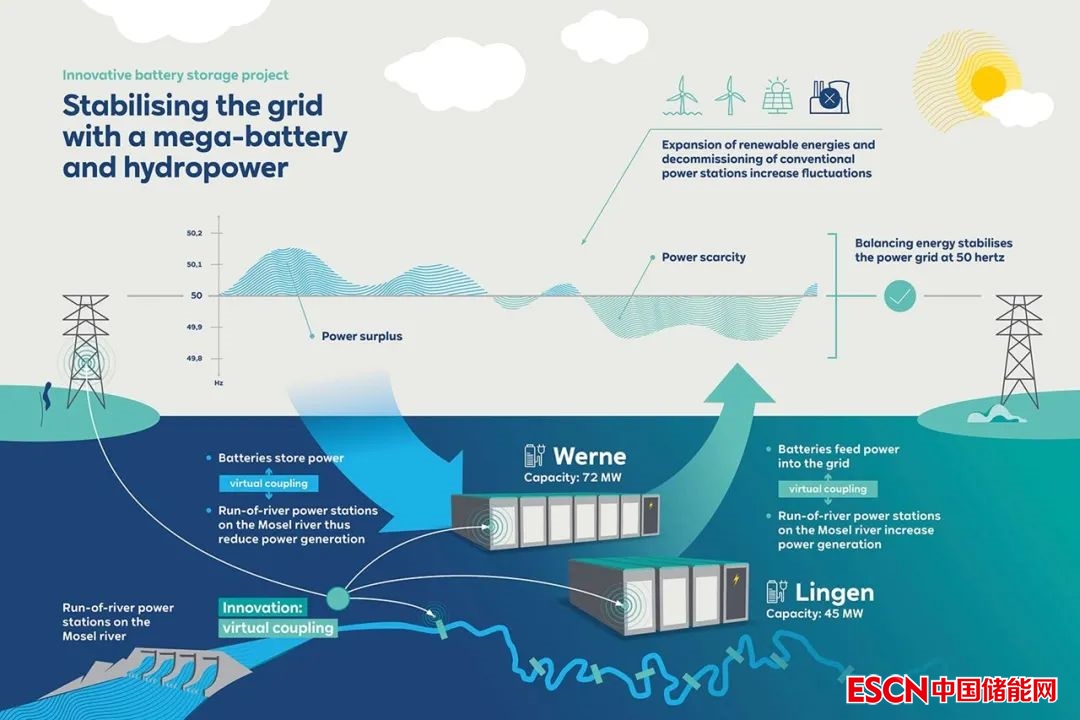 這二個(gè)電池儲(chǔ)能系統(tǒng)的特別之處在于它們與德國(guó)摩澤爾河沿岸的RWE徑流式水電站通過智能管理系統(tǒng)進(jìn)行虛擬耦合連接。