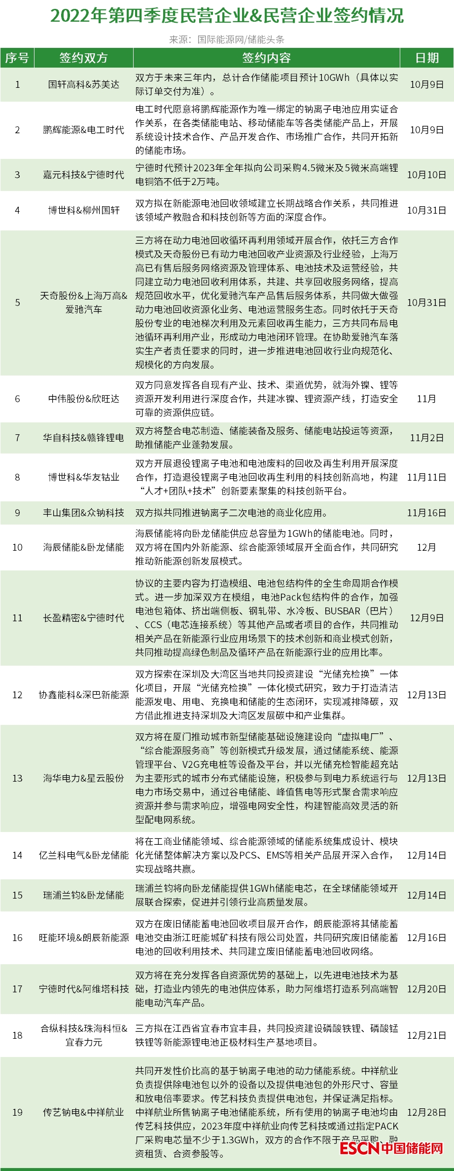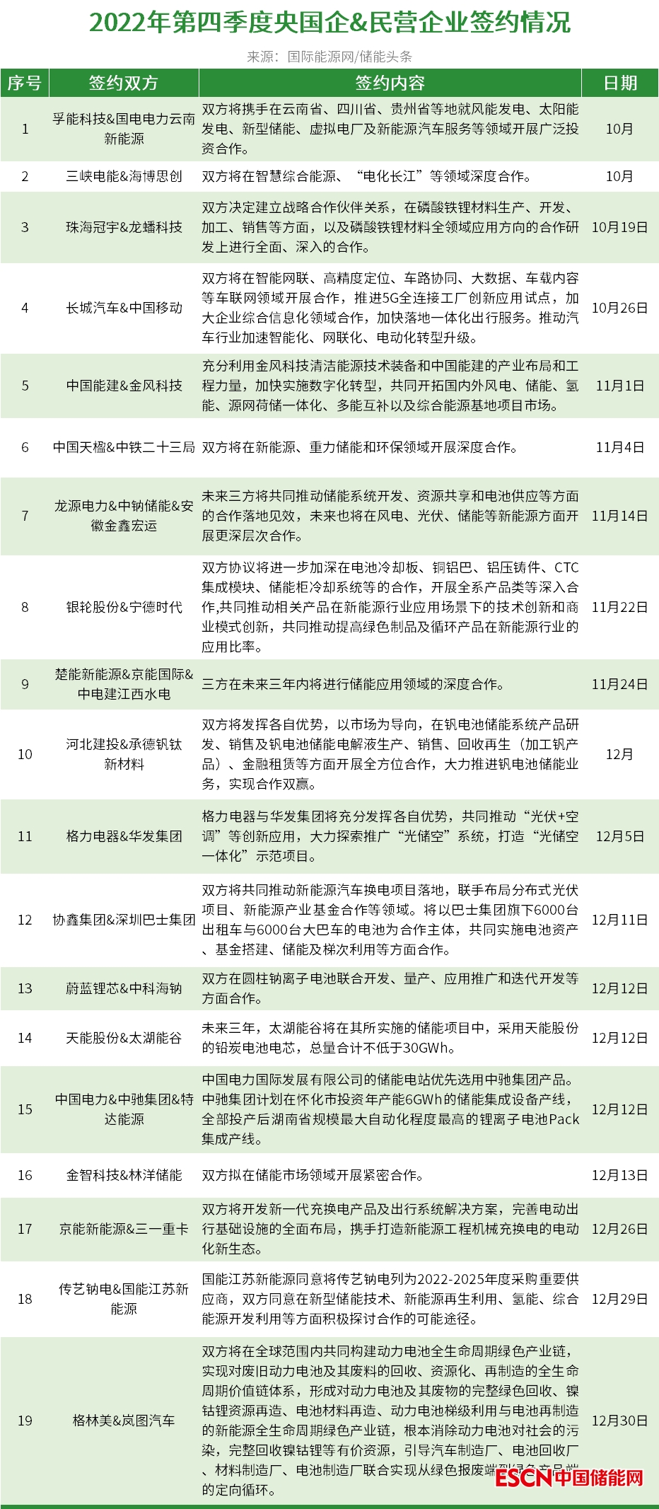 隨著儲(chǔ)能產(chǎn)業(yè)的高速發(fā)展,央國(guó)企+民企在儲(chǔ)能領(lǐng)域也開(kāi)展了緊鑼密鼓的合作之中。據(jù)國(guó)際能源網(wǎng)/儲(chǔ)能頭條(微信號(hào):chuneng365)統(tǒng)計(jì),2022年第四季度龍頭民營(yíng)與央國(guó)企共簽約19份合作協(xié)議。