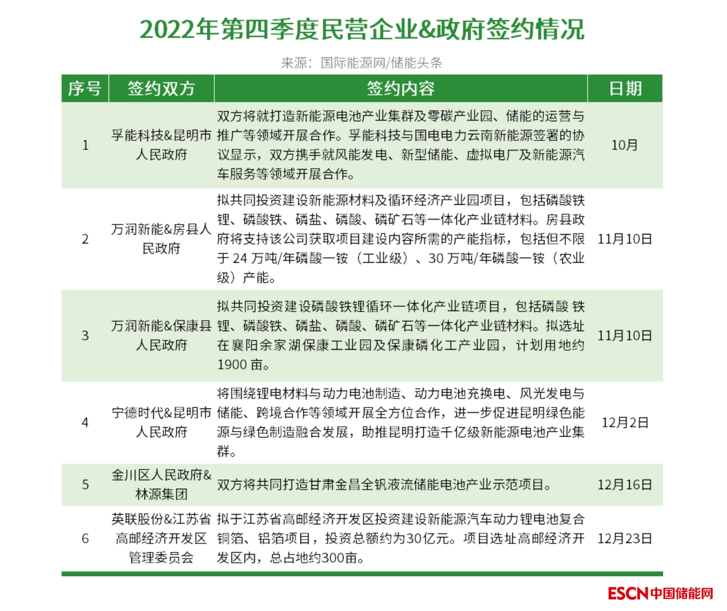 面對(duì)央國(guó)企的入局,孚能科技、萬(wàn)潤(rùn)新能、寧德時(shí)代、林源集團(tuán)等龍頭民營(yíng)企業(yè)也與各地政府展開(kāi)合作。據(jù)國(guó)際能源網(wǎng)/儲(chǔ)能頭條(微信號(hào):chuneng365)統(tǒng)計(jì),2022年第四季度龍頭民營(yíng)與各地政府共簽約6份合作協(xié)議。