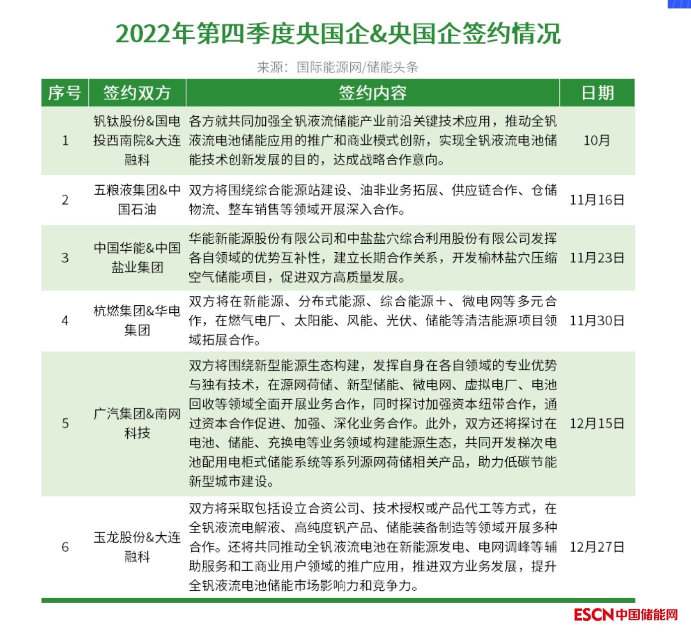 據(jù)國(guó)際能源網(wǎng)/儲(chǔ)能頭條(微信號(hào):chuneng365)梳理,2022年第四季度央國(guó)企間在儲(chǔ)能領(lǐng)域簽約6份協(xié)議,其中中國(guó)華能、華電集團(tuán)、國(guó)家電投作為電力行業(yè)先行軍,也加緊在儲(chǔ)能領(lǐng)域布局。