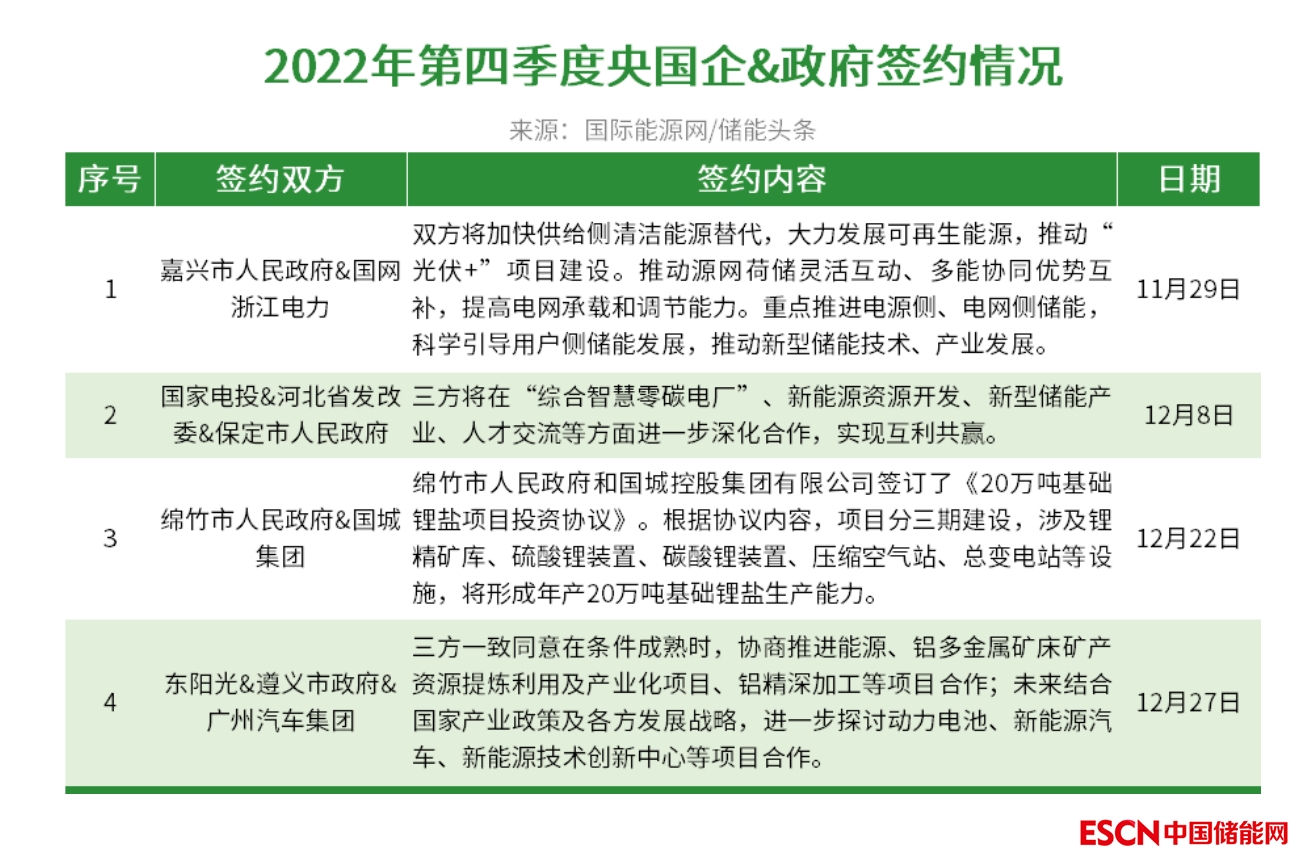據(jù)國(guó)際能源網(wǎng)/儲(chǔ)能頭條(微信號(hào):chuneng365)梳理,2022年第四季度央國(guó)企與各地政府共簽約4份合作協(xié)議,內(nèi)容涉及新型儲(chǔ)能、鋰鹽項(xiàng)目、動(dòng)力電池、新能源汽車等方面。