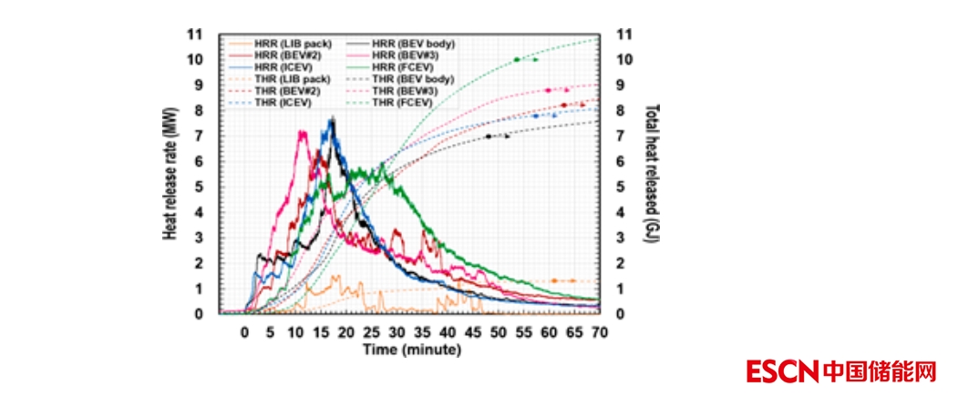 實(shí)驗(yàn)測試結(jié)果顯示六組實(shí)驗(yàn)對象整個(gè)火災(zāi)實(shí)驗(yàn)中峰值放熱功率依次分別為1.54 MW/7.81MW/ 6.51MW/ 7.25MW/ 7.66MW/ 5.99MW,總的放熱量依次分別為1.30GJ/ 7.53GJ/ 8.45GJ/9.03GJ/8.08GJ/10.82GJ。整個(gè)實(shí)驗(yàn)中車輛直到完全燒毀至少持續(xù)了70分鐘。在發(fā)生火災(zāi)約1-2分鐘,觀察到實(shí)驗(yàn)組2、實(shí)驗(yàn)組3和傳統(tǒng)燃油汽車的放熱功率迅速增加,導(dǎo)致這三組實(shí)驗(yàn)不同主要是由于火災(zāi)誘發(fā)工具在誘發(fā)火災(zāi)過程中釋放大量的熱所導(dǎo)致而并非試樣樣品的燃燒所導(dǎo)致。實(shí)驗(yàn)組從火災(zāi)發(fā)生約11–17分鐘后達(dá)到峰值放熱功率。實(shí)驗(yàn)過程中除FCEV外,其它實(shí)驗(yàn)組在達(dá)到峰值放熱功率后放熱功率迅速進(jìn)入衰減階段,相比FCEV在峰值放熱功率持續(xù)更長時(shí)間。對比總放熱量,實(shí)驗(yàn)組4總的放熱量(9.03GJ)與實(shí)驗(yàn)組1/實(shí)驗(yàn)組2放熱量的和(8.83GJ)相當(dāng),其中電池包釋放總熱量為1.30GJ,不含電電池組汽車車身火災(zāi)釋放的熱量為7.53GJ,可以認(rèn)為整個(gè)BEV發(fā)生火災(zāi)后熱量釋放與車身有其它部位可燃物的量有很大關(guān)聯(lián)性。同時(shí)對比發(fā)現(xiàn)BEV(含64kWh電池包)火災(zāi)總熱量大于傳統(tǒng)燃油車釋放的總熱量,小于氫燃料電池汽車總的熱量釋放,也與車重量有關(guān),進(jìn)一步分析火災(zāi)總熱量與汽車內(nèi)部可燃物重量息息相關(guān)。