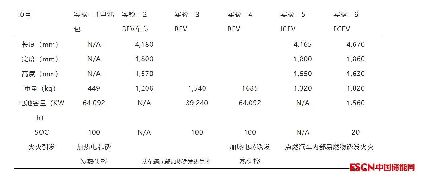 本次實(shí)驗(yàn)共設(shè)計(jì)了六組實(shí)驗(yàn),實(shí)驗(yàn)對象及誘發(fā)火災(zāi)具體條件如下表所示,為了使實(shí)驗(yàn)數(shù)據(jù)更具說服力,分別針對不含電池組的BEV、電池組、以及含有電池組的BEV進(jìn)行了火災(zāi)實(shí)驗(yàn)。作為對比同時(shí)還選擇了傳統(tǒng)燃油車和氫燃料電池汽車作為對照組進(jìn)行了對比實(shí)驗(yàn)。其中BEV選著了兩款汽車,一款帶電量為39KWh(短續(xù)航),一款為64KWh(長續(xù)航),燃料電池汽車中電池組帶電量較小約1.5KWh,其中電荷狀態(tài)為20%SOC。BEV所采用的電芯為NCM622軟包電池,電池標(biāo)準(zhǔn)容量為60Ah,能量密度為245Wh/kg。