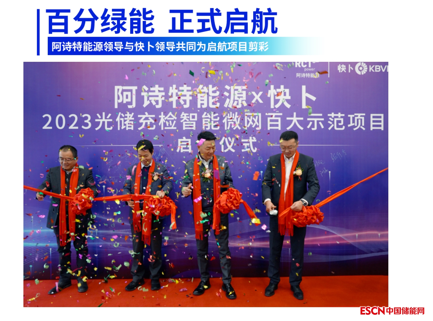 阿詩特能源董事長鄭文涌、總經(jīng)理石發(fā)成和快卜創(chuàng)始人孔艦、副總經(jīng)理費謙共同為阿詩特能源×快卜光儲充檢智能微網(wǎng)項目剪彩,該項目將會是雙方2023年合力打造的全國百個“光儲充檢站示范項目”之首,同時也將會是“光儲充檢智能微網(wǎng)”解決方案在零碳園區(qū)應用上的創(chuàng)新典范。