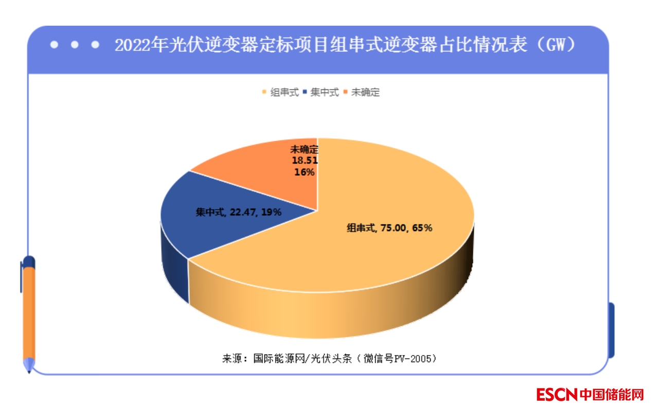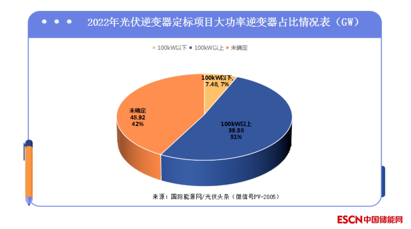 國際能源網(wǎng)/光伏頭條(PV-2005)統(tǒng)計,2022年全年,明確要求100KW及以上的逆變器項目容量達到59.58GW,100KW以下的逆變器采購項目為7.48GW,其余項目則沒有公布設備要求。