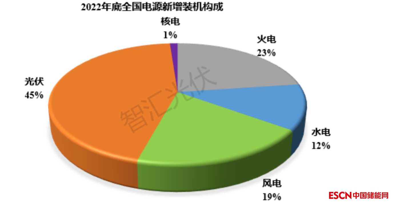 2022年,全國(guó)水電、火電、核電、風(fēng)電、光伏的裝機(jī)容量分別新增2387萬(wàn)千瓦、4471萬(wàn)千瓦、227萬(wàn)千瓦、3763萬(wàn)千瓦和8741萬(wàn)千瓦,合計(jì)19974萬(wàn)千瓦。2022年,各類電源新增裝機(jī)結(jié)構(gòu)如下圖所示。