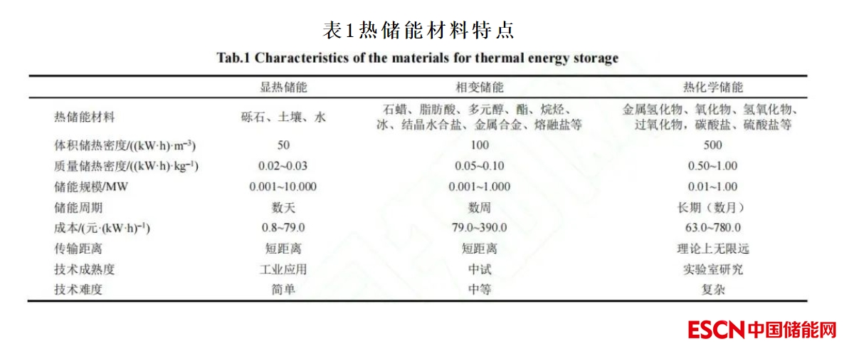 熱儲(chǔ)能是指將熱能儲(chǔ)存在特定的介質(zhì)中,并在需要時(shí)轉(zhuǎn)化為電能或其他形式能源的技術(shù)。表1對(duì)比了顯熱儲(chǔ)能、相變儲(chǔ)能、熱化學(xué)儲(chǔ)能材料的特點(diǎn)。